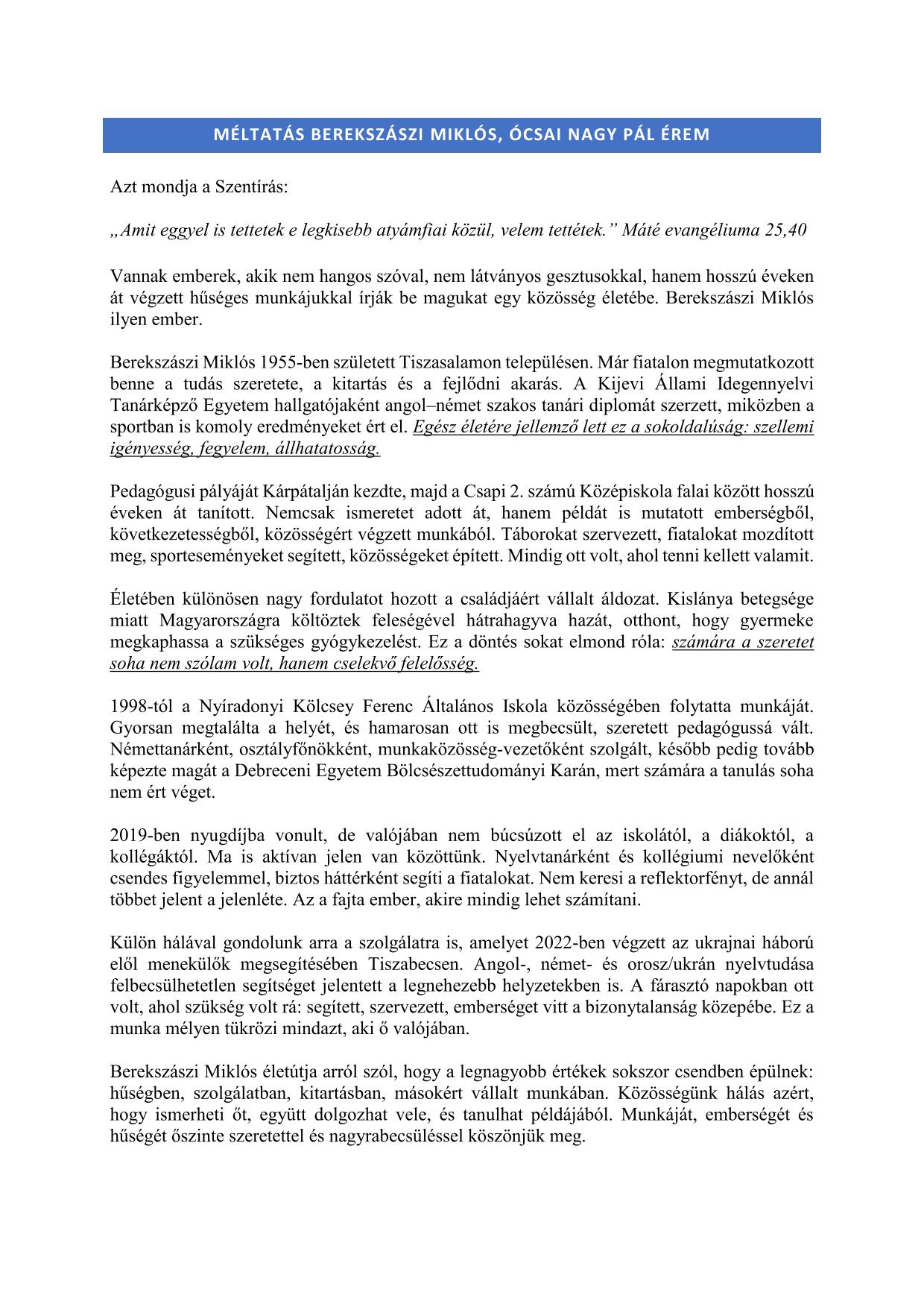 Nagy büszkeséggel osztjuk meg a hírt, hogy kollégánk, Berekszászi Miklós több évtizedes, alázatos munkáját fenntartónk, a Baptista Szeretetszolgálat Ócsai Nagy Pál éremmel ismerte el.