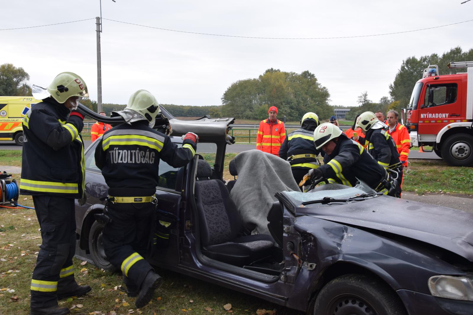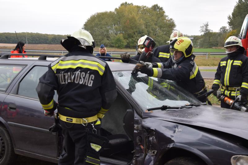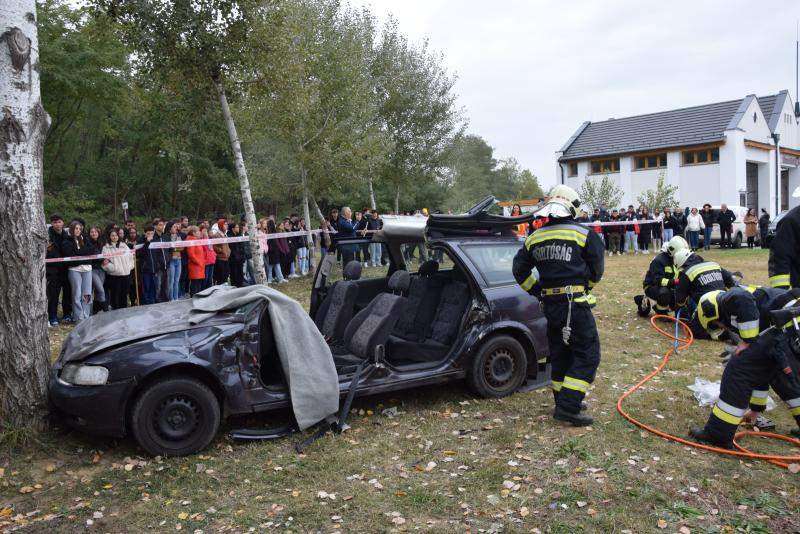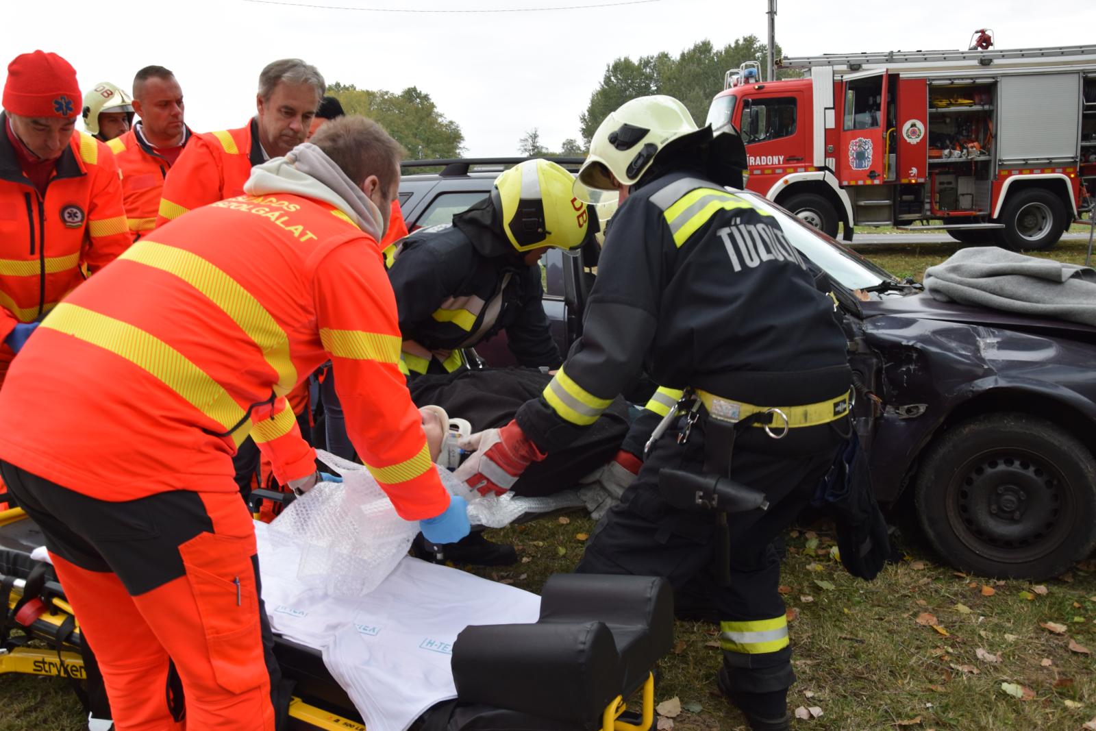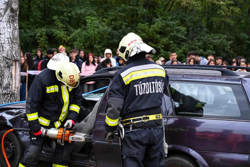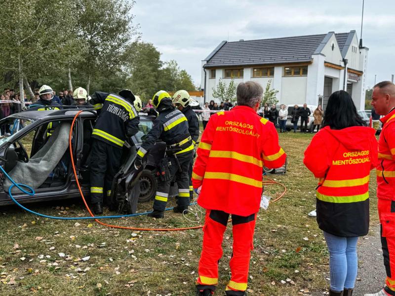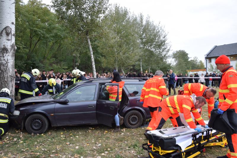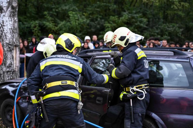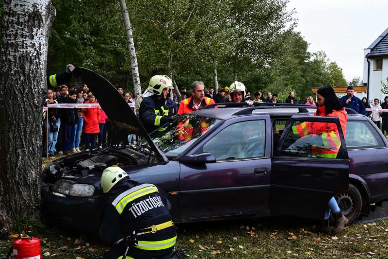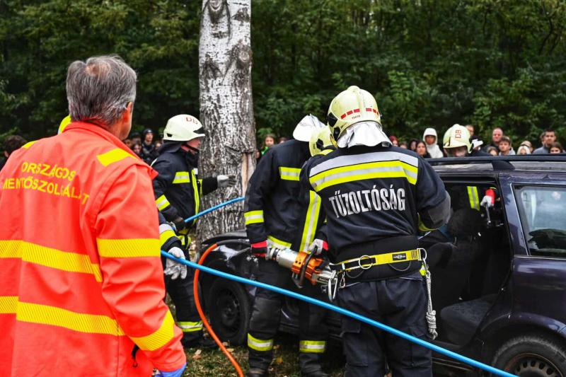 A tűzoltók látványosan mutatták be, hogyan használják a feszítő-vágó berendezést, hogyan mentenek ki beszorult sérülteket, a mentők pedig megmutatták, milyen gyors és precíz beavatkozásokkal stabilizálják a sérültek állapotát még a helyszínen.