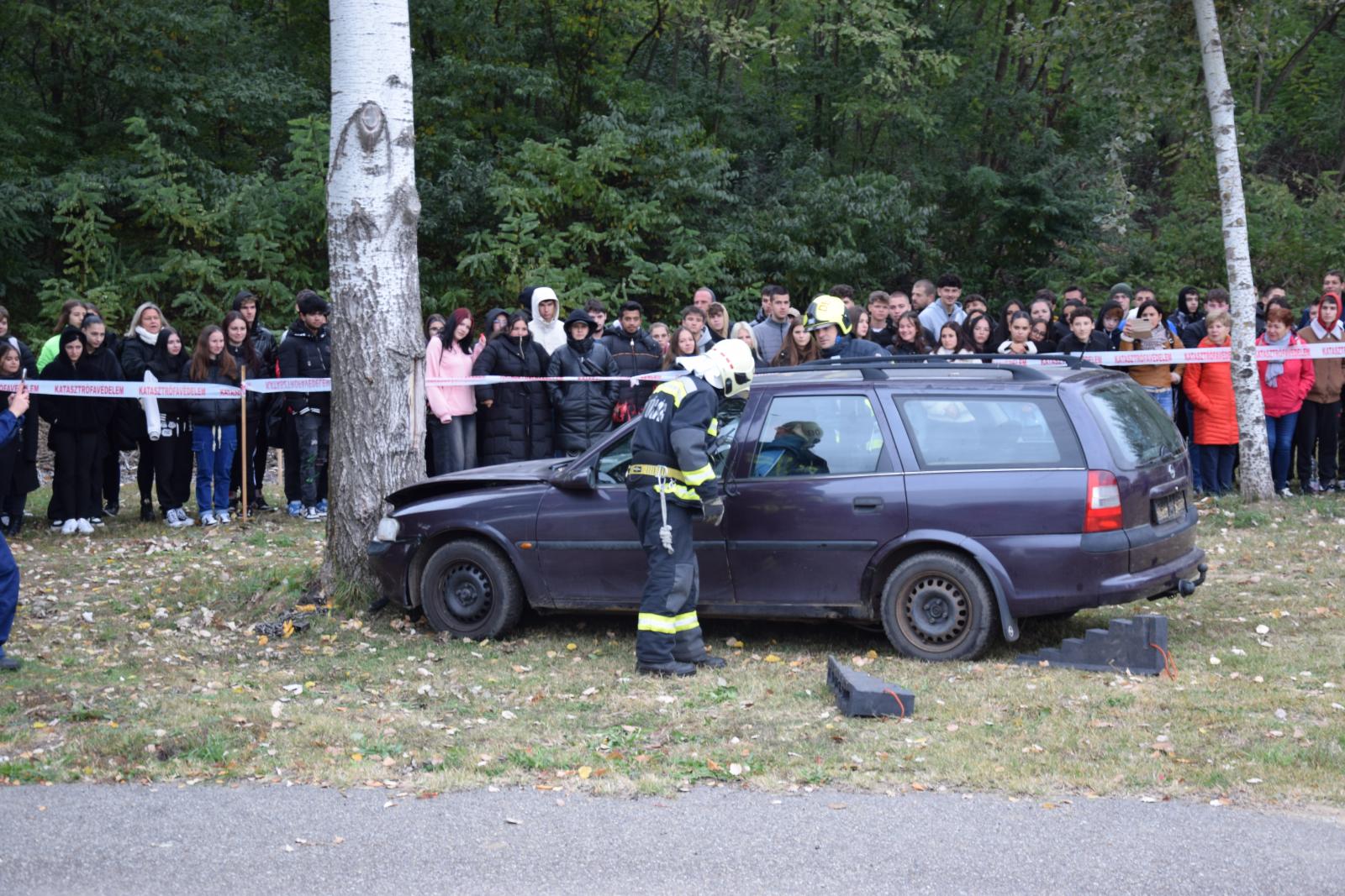 Szerencsére mindez ezúttal nem egy valódi baleset volt, hanem pályaorientációs napunk egyik legizgalmasabb programpontja – egy valósághű, közös rendvédelmi és mentési bemutató.