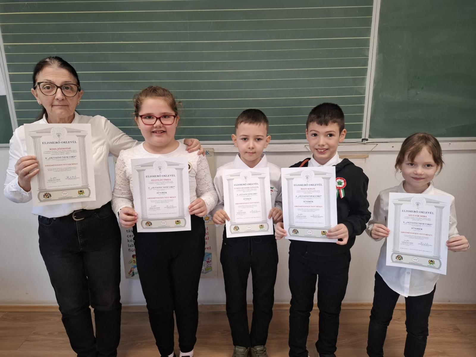 A 2. a osztály tanulói, Felföldi Tímea, Szulyák Mira, Bojti Kolos, Lukács Richárd Levente a MÍG MEGNÖVÖK AKKREDITÁLT TEHETSÉGPONT szervezésében, "OLVASNI NEM CIKI!" Kárpát-medencei Csapatverseny országos döntőjébe jutott. Felkészítő tanár: Kima József Lajosné